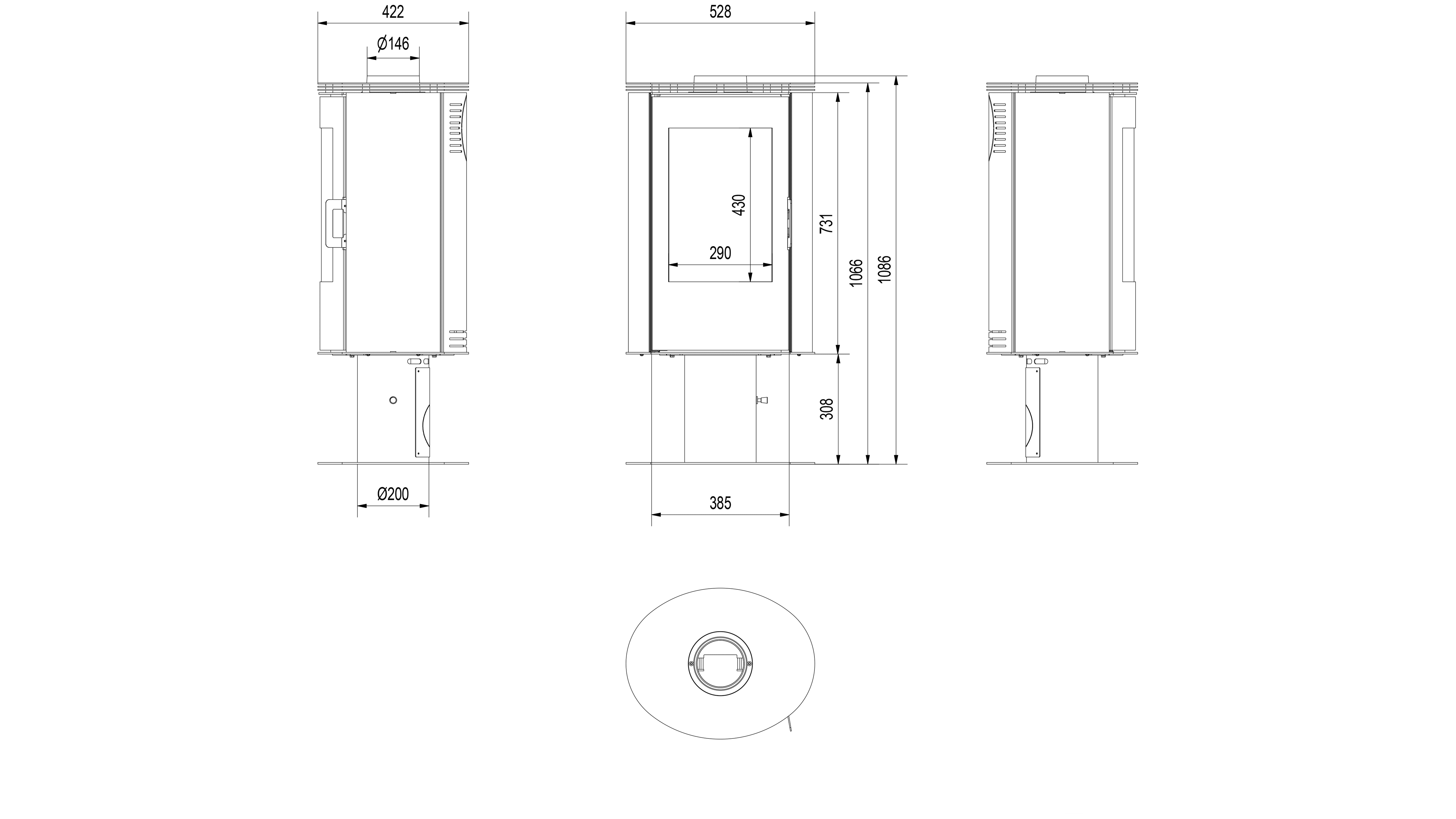 Teho 8-12 kW, hyötysuhde 78%, paino 107 kg, korkeus 1086 mm, leveys 528 mm, syvyys 422 mm, hormiliitos D150 mm päällä ja takana, palokaasut 275°C, CE merkitty, turvaetäisyys palavaan eteen 800 mm, sivulle ja taakse 200 mm. Halon pituus 25 cm.