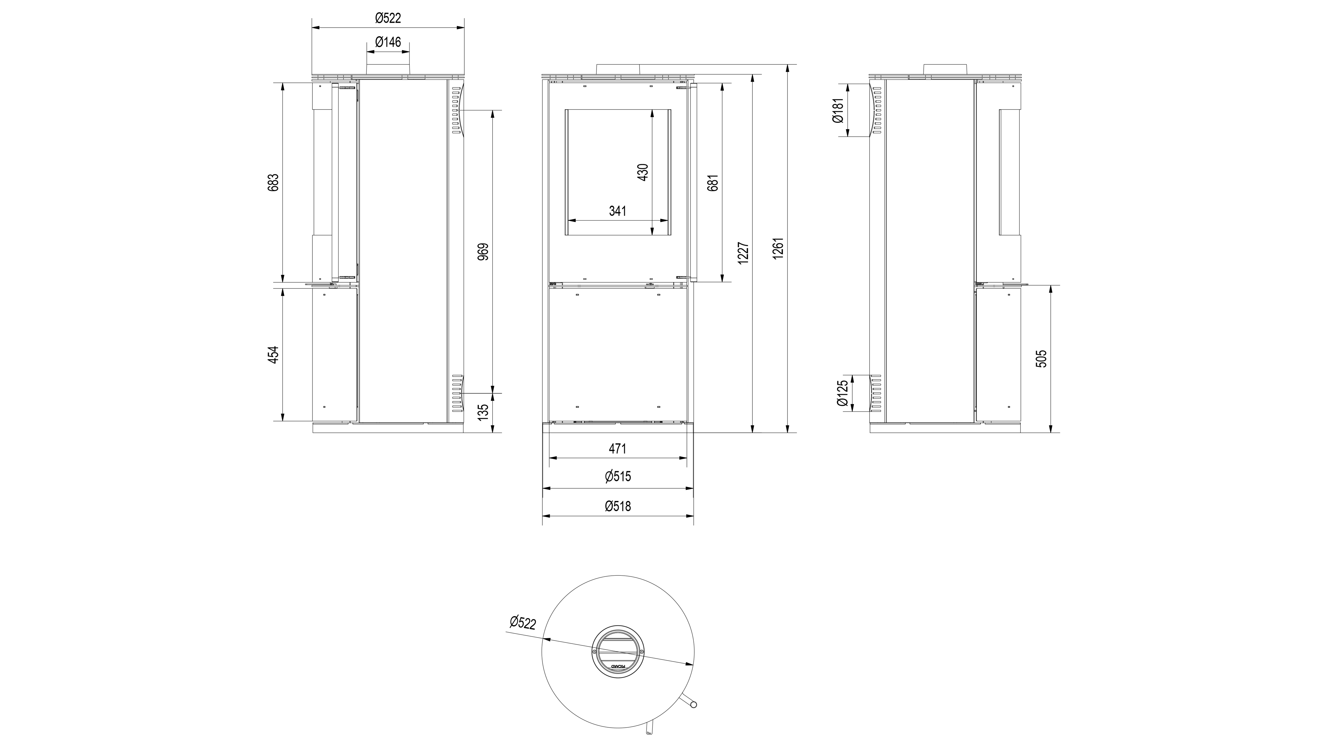 Teho 8-12 kW, hyötysuhde 80%, paino 137 kg, korkeus 1261 mm, leveys 518 mm, syvyys 522 mm, hormiliitos D150 mm päällä ja takana, palokaasut 231°C, CE merkitty, turvaetäisyys palavaan eteen 800 mm, sivulle ja taakse 200 mm. Halon pituus 25 cm.